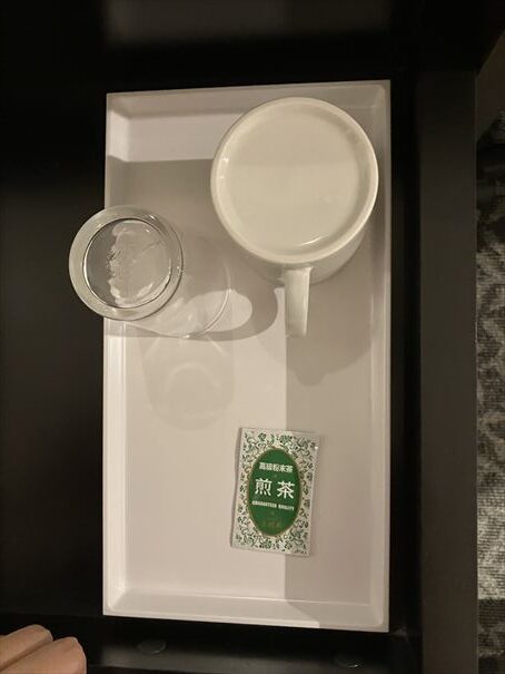 飲み物はマグカップとインスタントの緑茶が置かれていました。